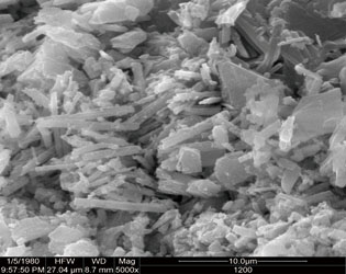 正常的二水硫酸鈣晶體的平均長(zhǎng)度約為10微米,平均直徑約為0.8微米,晶體形貌呈現(xiàn)針簇狀;