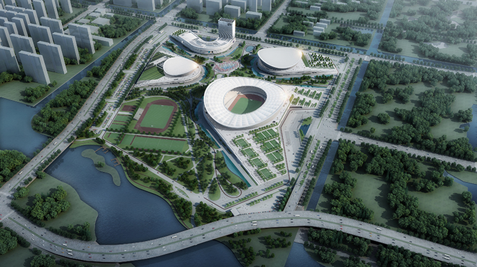 通過(guò)全球范圍內(nèi)的競(jìng)賽征集,園區(qū)體育中心采用德國(guó)gmp建筑師事務(wù)所設(shè)計(jì)的總體方案。設(shè)計(jì)師以“園林、疊石”為創(chuàng)意理念,用現(xiàn)代建筑設(shè)計(jì)語(yǔ)言詮釋園林意韻,將建筑物巧妙融入自然景觀,輕盈優(yōu)雅,舒緩工巧,力求打造成現(xiàn)代與傳統(tǒng)、藝術(shù)與實(shí)用、科技與人文有機(jī)融合的體育建筑精品。
