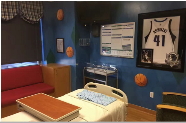 不僅如此,該院兒科的每一間病房還都有一個繪畫主題,小患者可以根據(jù)自己的喜好來選擇房間。我們參觀了一間以籃球為主題的空病房,房門上是達(dá)拉斯小牛隊的隊徽,墻壁上畫著各種與籃球有關(guān)的圖案,墻上還掛著諾維斯基的41號球衣。我想,如果一個小籃球迷在這樣的環(huán)境中接受治療,恐怕都會不想出院了吧?