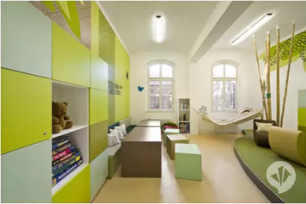 ②走廊應(yīng)避免過于單調(diào),可使用鎮(zhèn)靜色系——藍(lán)綠色系,這樣可以使兒童的緊張情緒得以放松、平緩。