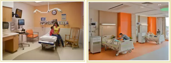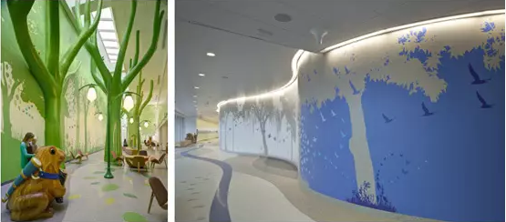 不同的科室,對色彩的設(shè)計(jì)要求有各有不同,消化科和心理科病房一般以黃色為主;外科多是以藍(lán)色和綠色為背景;康復(fù)科以棕色為主;急診室宜采用淺藍(lán)的冷色調(diào);而兒童病區(qū)宜采用太空、海洋、森林等自然色彩格調(diào),并以卡通人物和各種動物為背景。