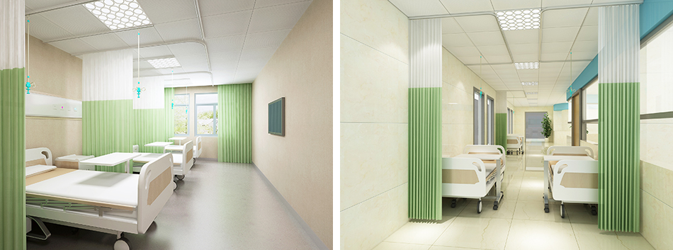 2、軌道集成。龍骨與吊簾及輸液軌道集成一體化,吊頂變得整齊劃一,不在凌亂;