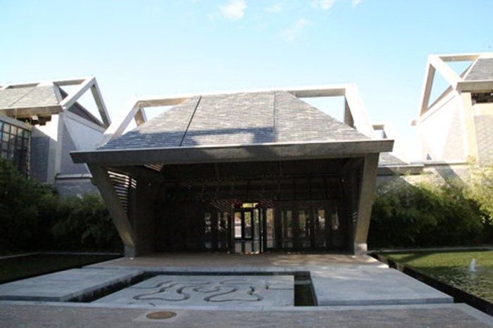 建筑采用模數(shù)化的清水混凝土梁柱板和斜屋架,帶有中國(guó)傳統(tǒng)木構(gòu)體系的韻味,室內(nèi)裝修在材料、顏色和陳設(shè)上更追求一種中國(guó)文化的淡雅和靜謐。室外庭園設(shè)計(jì)既有以中式傳統(tǒng)庭園手法設(shè)計(jì)的區(qū)域,也有采用現(xiàn)代西式景觀設(shè)計(jì)的區(qū)域,還保留了許多地段內(nèi)原有的大樹(shù)和少量老建筑,注意與周邊環(huán)境的融合。