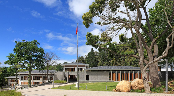建筑形態(tài)以低矮舒緩的灰屋頂下穿插灰磚粉墻,追求親切宜人的書(shū)院氛圍,也與現(xiàn)狀中總領(lǐng)事官邸的當(dāng)?shù)貧v史建筑相協(xié)調(diào),景觀設(shè)計(jì)上特別精心地保護(hù)了用地周邊的參天松柏,配合以草坪、花卉,還在有限的用地內(nèi)設(shè)計(jì)了泳池和球場(chǎng)。