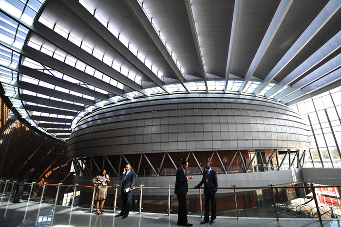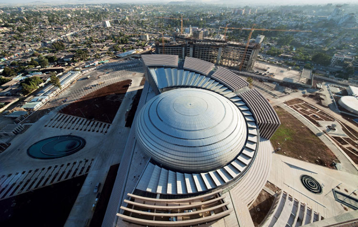 非盟會(huì)議中心包括一棟高99.9米共20層的辦公主樓、一個(gè)2550個(gè)座位的主會(huì)場(chǎng)、一個(gè)681個(gè)座位的中會(huì)議廳、31個(gè)小會(huì)議室、多功能廳、緊急醫(yī)療中心、數(shù)字圖書(shū)館等。建筑設(shè)計(jì)中包含了很多具有象征意義的元素,如綜合辦公樓高度為99.9米,象征著1999年9月9日“非盟日”,而環(huán)形的會(huì)議中心則象征著非洲的團(tuán)結(jié)。