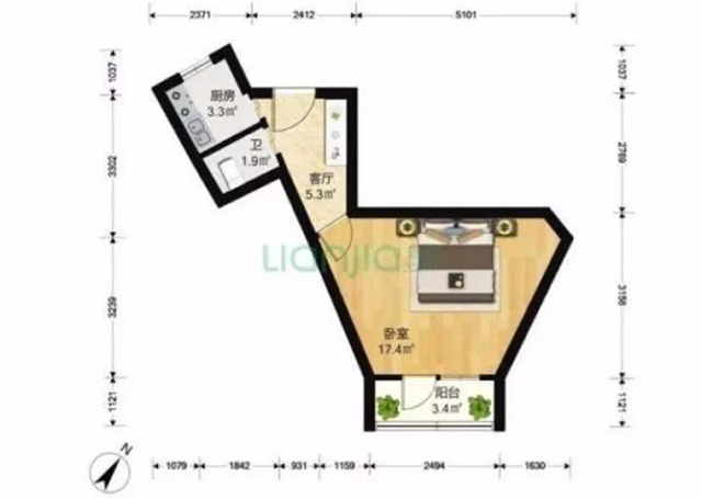 一室一廳一廚一衛(wèi),還帶陽(yáng)臺(tái)。戶型雖奇葩,五臟俱全。作為馬桶造型,底座、桶身、水箱都很傳神。