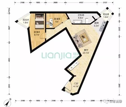 左下方向,像一個(gè)張開(kāi)嘴的惡魔。兩室一廳一廚一衛(wèi)雙陽(yáng)臺(tái)。西北方向和東北方向兩個(gè)觸角式陽(yáng)臺(tái)完成了房間的全部采光。