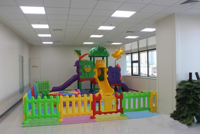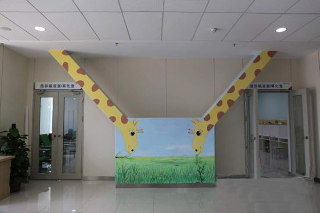 當(dāng)天,記者在省兒童醫(yī)院看到,整個(gè)醫(yī)院的布局都十分活潑、可愛,搶救室的床單都是帶花的,急診科旁還設(shè)有兒童樂園。下圖為星立方集成吊頂下的兒童樂園。