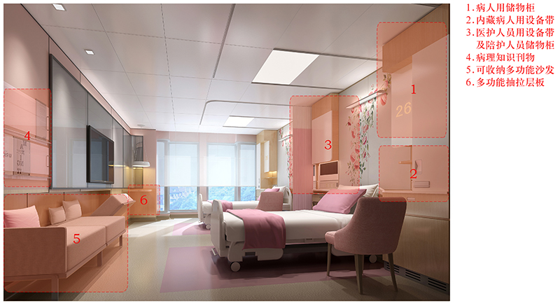 婦科病房整體采用家居般的風(fēng)格,家是“溫馨”的港灣,病房是患者在醫(yī)院停留時(shí)間最長(zhǎng)的場(chǎng)所,一體化病房致力于讓患者享受居家板的空間體驗(yàn)。