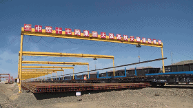 施工時,單條30噸重、500米長的鋼軌可以雙軌同時鋪設(shè)。