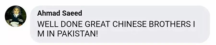 Ahmad Saeed:厲害啊,中國兄弟!巴基斯坦(兄弟)致!