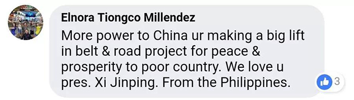 Elnora TiongcoMillendez:中國的“一帶一路”倡議為貧窮國家的和平與繁榮作出了巨大貢獻(xiàn)。我們熱愛您,習(xí)近平主席。菲律賓友人致。