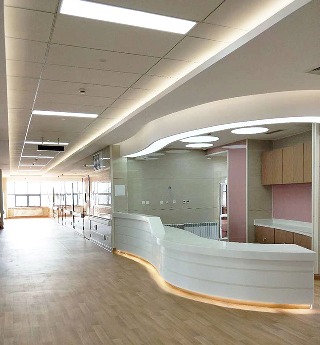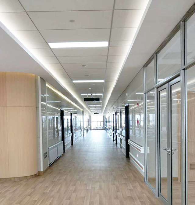 住院樓公共走道在考慮采光及空氣狀況的情況下,采用了星立方具有凈化空氣、降解甲醛、殺菌滅菌等功效的負離子生態(tài)硅晶板,并在走道兩側(cè)加上暗藏?zé)粲靡栽黾庸庠矗拐麄€走道空間保持自然清新、明亮通透,有利于患者的身心健康。