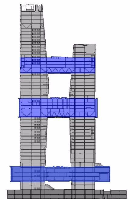 兩座塔樓由三個(gè)位于不同高度的天橋連接。