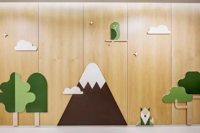 墻壁以及玻璃上常常會(huì)出現(xiàn)山、云、等自然元素圖形,還有樹木、抽象卻可愛的動(dòng)物甚至宇宙飛船等卡通形象圖案。