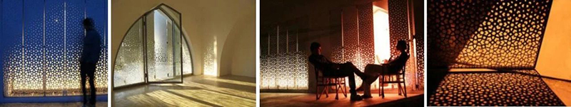 設(shè)計(jì)師在拱門(mén)外鑲嵌了一層外表皮,雕刻以美麗的花紋,有了這塊鏤空的水切鋁板表皮,白天,陽(yáng)光透過(guò)玻璃灑向室內(nèi)的光影浮動(dòng),變幻莫測(cè);到了夜晚,室內(nèi)的光暈向外透射,建筑立面呈現(xiàn)出了光彩盈動(dòng)的效果(圖片來(lái)源:https://www.dezeen.com/2010/12/19/casa-puglia-by-peter-pichler)