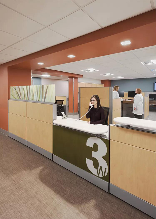 麻省大學(xué)紀(jì)念醫(yī)學(xué)中心建筑面積共13564平方米,通過這次的現(xiàn)代化改造,將私人病房的數(shù)量增加了58%,數(shù)量達(dá)到了全部病房數(shù)的80%,將原來的護(hù)士站和醫(yī)生辦公室規(guī)劃成了醫(yī)護(hù)團(tuán)隊(duì)協(xié)作工作站,同時(shí)還增加了學(xué)習(xí)和交流空間。