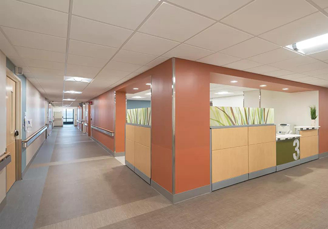 例如在工作站的柜臺(tái)上方放置織物包裹的面板,起到吸收聲音的效果;營養(yǎng)室的門降低了室內(nèi)制冰機(jī)的噪音;用于存儲(chǔ)醫(yī)療用品和設(shè)備的雙通道支持空間減少了患者房間門打開和關(guān)閉的次數(shù);人流量大的區(qū)域采用的專業(yè)橡膠地板不再打蠟,因此可以減少日?;顒?dòng)產(chǎn)生的噪音;在病房門上添加玻璃視覺面板,即使病房門關(guān)閉,也可以在室外進(jìn)行目視觀察。