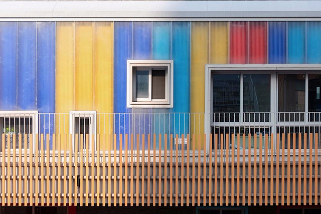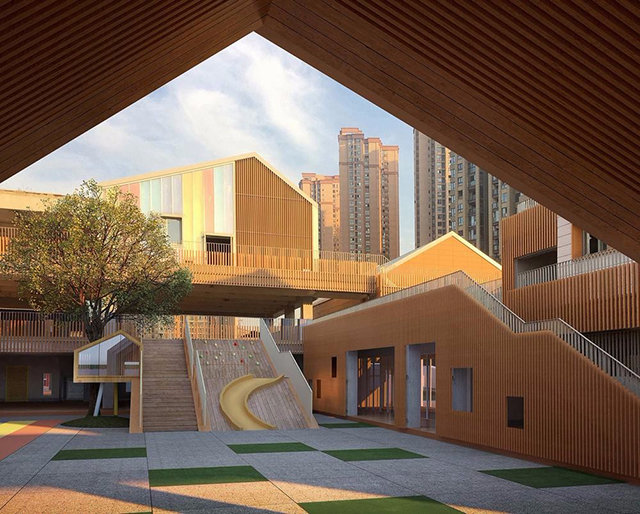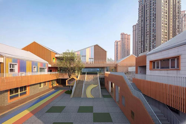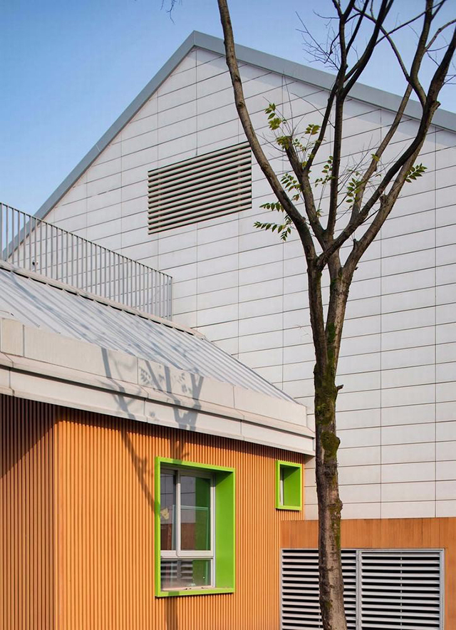 Every classroom is a "home" which has its own characteristics. IDO intended to let the kids to build a sense of belonging in their respective classrooms, which were built with distinctive materials such as wood and bricks. Each volume features a unique material palette. The architects applied various materials to the exteriors, including terracotta panels, red and gray bricks, faux wood, cement fiber boards, and polycarbonate sheets, etc. By utilizing polycarbonate sheets, they worked to explore the possibility of creating spatial ambience via translucent materials, which present colorful rhythm under the sunshine. The roofs were finished with Al-Mg-Mn alloy in a unified way, which not only coordinates with the colorful facade but also creates an illusionary "snow-covered" landscape.