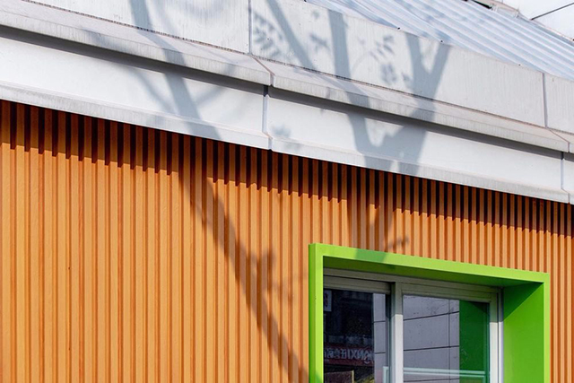 在立面系統(tǒng)上建筑師嘗試使用了不同的材質:陶板、紅磚、青磚、仿木材料、水泥纖維板、聚碳酸酯板。通過使用聚碳酸酯板,探討半透明材料在幼兒園教育空間中的氛圍營造可能性,使其在陽光下體現(xiàn)出多彩的韻律。