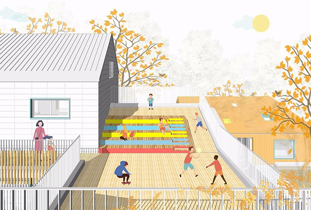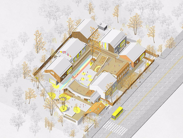 結合用地具體情況與園方的教育理念,建筑師提出了“村落”的概念,希望該幼兒園建成后能成為一個孩子們可以自由探索的“城市村落”。