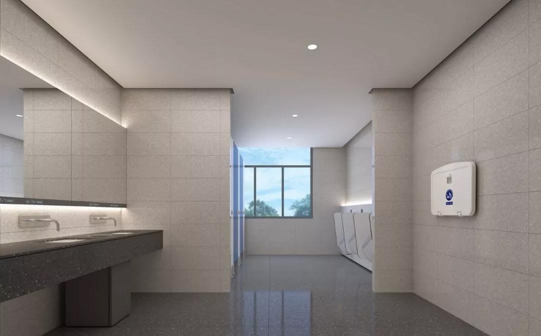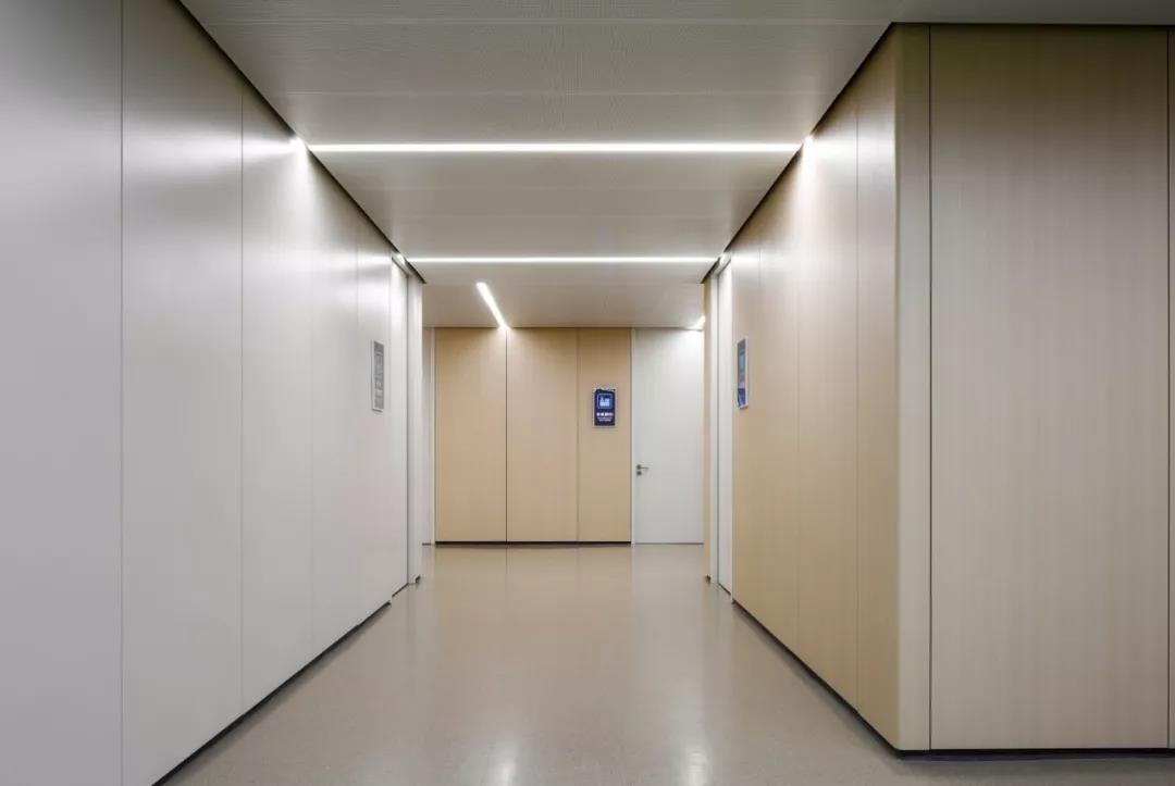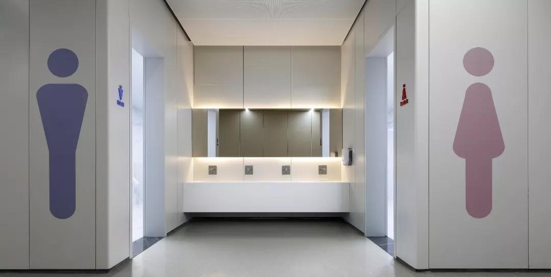 在運(yùn)行維護(hù)方面,金屬墻面、橡膠地面、穿孔鋁板吊頂?shù)谋嵎浅7奖恪L貏e是金屬墻板、鋁板吊頂都是工業(yè)化生產(chǎn)的成品,不同批次的產(chǎn)品達(dá)到了高度標(biāo)準(zhǔn)化和一致性,更換時(shí)不必?fù)?dān)心色差的問(wèn)題。而且墻面、吊頂?shù)陌惭b均采用集成工法,安裝和更換操作簡(jiǎn)單便捷。圓弧形邊界的設(shè)計(jì),不但利于保護(hù)人員安全,而且便于保潔人員清理。地板與墻面、樓梯與墻面的交界處均設(shè)有凹槽,為清潔操作提供方便。衛(wèi)生間的洗手盆、馬桶沒(méi)有顯露在外的排水管,避免了排水管與地面交界處的粘合膠帶來(lái)的美觀性問(wèn)題,而且便于清潔。