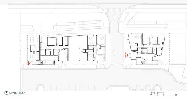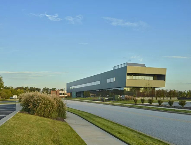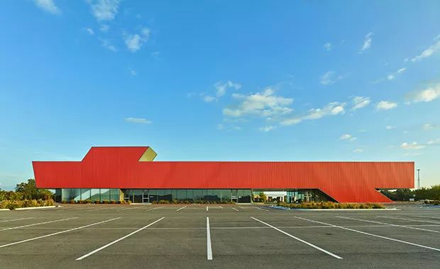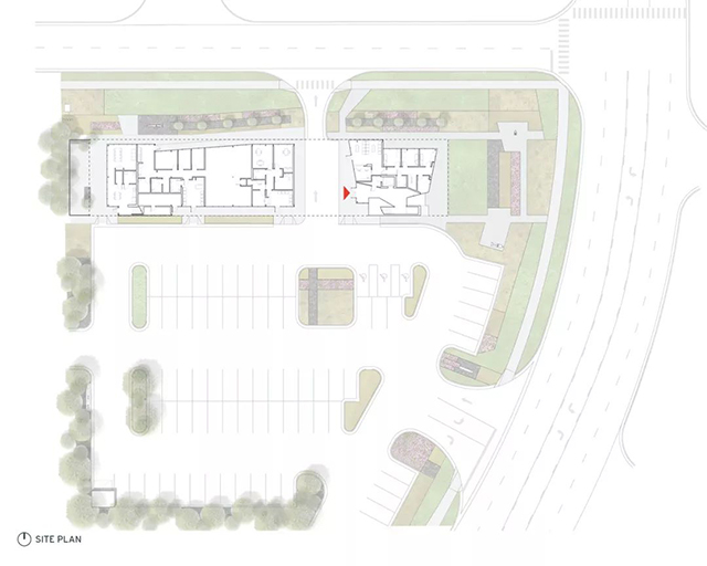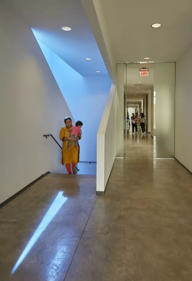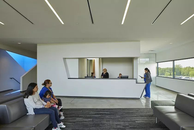 該建筑外形設(shè)計(jì)獨(dú)特,剛烈粗獷,不僅為該地區(qū)的主要商業(yè)走廊-南52街塑造了高大的形象,同時(shí)也為當(dāng)?shù)貎和透改妇驮\提供了顯著的標(biāo)志。大面積的卡宴色金屬面板包裹了建筑南立面,而立面邊緣的天窗又為整棟建筑提供了自然光通道,同時(shí)還在視覺(jué)上延伸了建筑的長(zhǎng)度??ㄑ缟饘倜姘逑路綖橐粯侨肟冢@里還專門設(shè)計(jì)了一個(gè)患者落客區(qū),方便來(lái)往診所的患兒及其陪護(hù)人員出入。落客區(qū)通道兩側(cè)的空間都被包裹在玻璃立面中,不僅與周圍的景觀建立了聯(lián)系,也與診所上方層樓建立了視覺(jué)和材料上的分隔。