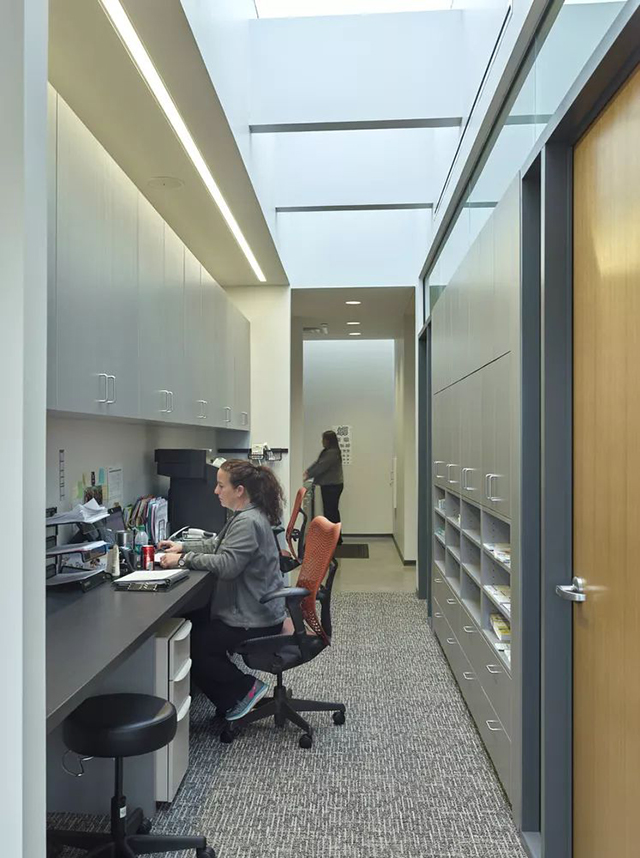▲ 從護(hù)士站上方的天窗照入室內(nèi)的自然光線為整個(gè)工作室?guī)?lái)了活力
