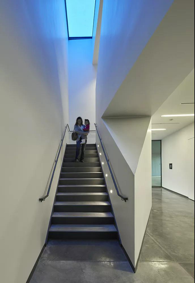 從一樓入口進(jìn)入建筑物后,可以通過(guò)嵌入在建筑 “基座”中的樓梯上行。天窗上方的藍(lán)色玻璃仿佛為照射進(jìn)來(lái)自然光線戴上了有色濾鏡,將藍(lán)色光線灑滿了樓梯,使得整個(gè)空間充滿了爛漫氣息。診所內(nèi)部絢麗的色彩應(yīng)用增強(qiáng)了空間的垂直感,意示著上方樓層有一個(gè)利于身體康復(fù)的空間。沿著樓梯上行,即可到達(dá)大樓東側(cè)的候診室。建筑東部玻璃墻上的紙板可以保護(hù)內(nèi)部空間免受過(guò)度自然光的照射,同時(shí)起到調(diào)節(jié)室內(nèi)亮度和溫度的作用。