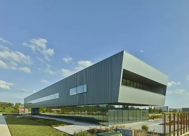 卡宴色金屬面板是為該建筑專門定制的外立面顏色。建筑物的北側(cè)使用了標(biāo)準(zhǔn)的風(fēng)化鋅金屬板,從表面上看,它在形式上顯得更加安靜與抽象。帶狀的窗戶設(shè)計(jì)增強(qiáng)了整個(gè)建筑形體的水平狀態(tài),深色與冷灰色的碰撞應(yīng)用更加增強(qiáng)了建筑的穩(wěn)固感,同時(shí)凸顯了南立面飽和、溫暖的色調(diào),冷暖色調(diào)的碰撞式設(shè)計(jì)使得整個(gè)建筑物更加鮮明和立體。