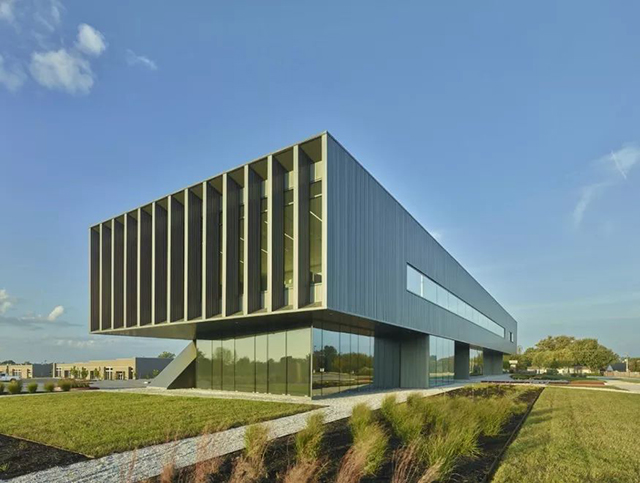 建筑西立面的挑檐采用了扁平的金屬面板輪廓,而金屬框架肋板輪廓為北立面和南立面增添了微妙的紋理質(zhì)感。整個(gè)外立面都使用了定制化的斷裂金屬飾邊,從而使外墻的細(xì)節(jié)得以放大,從而增強(qiáng)了建筑物的抽象質(zhì)感,雅致而不張揚(yáng)。