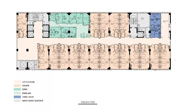 醫(yī)院各部門對建筑的要求各不相同,由于住院部的面積比例大(約占總面積的 45%),且房間構(gòu)成及數(shù)量穩(wěn)定,相對其他部門來說設(shè)計彈性較小,所以既有建筑能否滿足住院部的要求往往是改造的關(guān)鍵。病區(qū)是一組護士對一組住院患者逬行護理的場所,為保證運營效率,一個病區(qū)宜設(shè)置40 ~ 45 床,建筑面積約 1300 ~ 180平方米。若既有建筑的標(biāo)準層面積較小,也可設(shè)置床位 20 ~ 30 床,但必須設(shè)置護士站、治療室等醫(yī)護用房。病房開間宜達到 4.0 米,不宜小于 3.75 米,為方便手術(shù)部、康復(fù)訓(xùn)練部等大空間的布局,既有建筑的柱間距不宜小于 7.5 米。