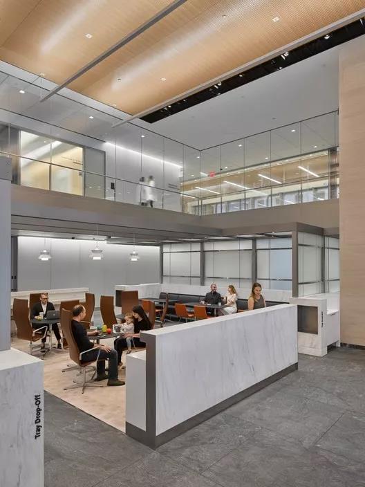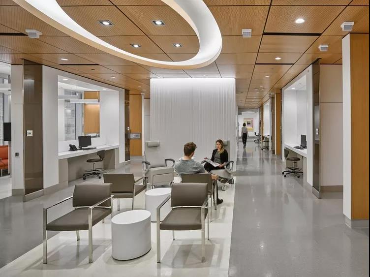 通常為于地下室區(qū)域的注射和腫瘤放射的區(qū)域被放置在了建筑的4樓,這樣的安排使患者和醫(yī)護(hù)人員可以接觸到自然光。這是DavidH.Koch中心優(yōu)先為患者為中心的護(hù)理而考慮,而并非因其他因素考慮的一個(gè)例子。輸液區(qū)設(shè)有各種治療環(huán)境,從私密的房間到溫馨宜人的社區(qū)空間。由一個(gè)完整的藝術(shù)項(xiàng)目在整個(gè)建筑內(nèi)的關(guān)鍵位置放置了各種各樣的作品,為接受治療的患者帶來(lái)積極的影響。