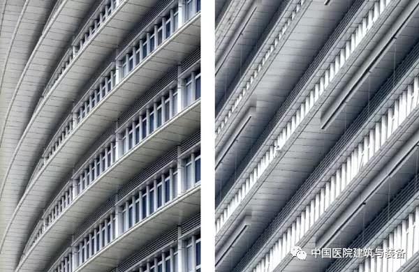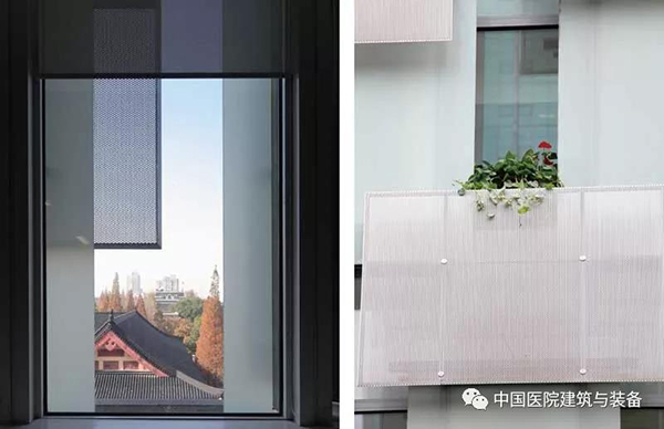 住院樓的外遮陽板美化了病房外觀,不僅如此,橫向遮陽板的高低位置設(shè)計(jì)也是依照病房窗戶而固定間距。病房內(nèi)的窗戶分為兩段,上段為懸窗,下段為推拉窗,把懸窗外的部分做成晾衣架,既減少了患者交叉,又保持了相對安靜的環(huán)境。