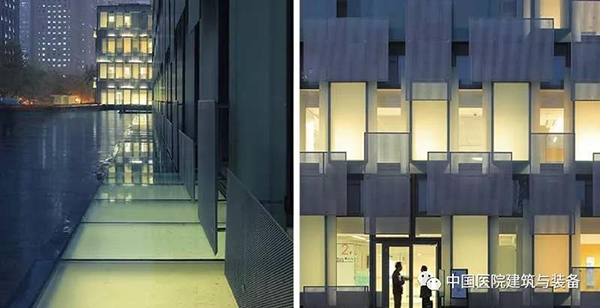 再者,這種立面可以濾光。最內(nèi)層的凹窗和中間層的凸窗之間形成了一個空間,同時這也是利用了很有中國特色的窗紙藝術(shù)應(yīng)對光線的變化,如遇強(qiáng)光、陰天暗光,通過第二層的磨砂玻璃對光線進(jìn)行過濾,使進(jìn)入室內(nèi)的光線成為柔和怡人的漫射光,營造干凈、安靜的醫(yī)療環(huán)境。最外層表皮懸掛了大量的金屬銅板制作的遮陽板,對整體建筑起到了外遮擋作用,也保護(hù)其背后的常春藤,這些常春藤為每間病房與辦公室提供了綠色;觀景的功能則由最內(nèi)側(cè)全透明的凹窗承擔(dān)。