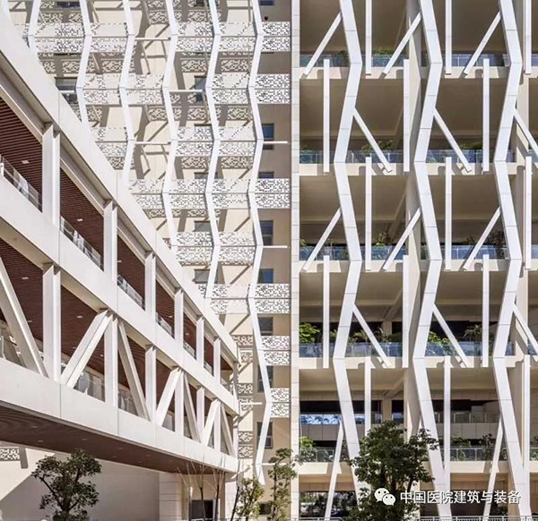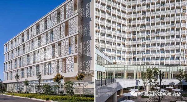 門診部雙層外墻系統(tǒng)內(nèi)為混凝土墻面、水平混凝土挑板外包鋁單板系統(tǒng),水平向安裝鋁合金打孔板遮陽板。為了解決因窗體大小不同、各不對稱,影響視覺效果的問題,將外立面采用窗花樣式的創(chuàng)新遮板設(shè)計(jì),既美觀又節(jié)能。