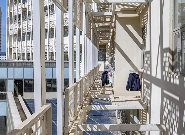 該立面系統(tǒng)由里到外為混凝土墻面,配有開啟式鋁合金窗系統(tǒng)、晾衣架系統(tǒng),水平向豎直安裝鋁合金打孔板,垂直采用鋁板裝飾系統(tǒng)。達(dá)到的效果是過濾遮擋太陽直射線,無遮擋對外視線,提供直射陽光。外墻系統(tǒng)可實(shí)現(xiàn)平衡的透氣性,同時創(chuàng)造出獨(dú)特的立面材質(zhì)機(jī)理。