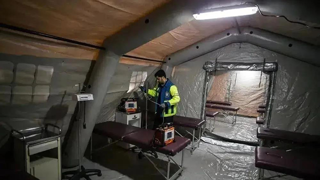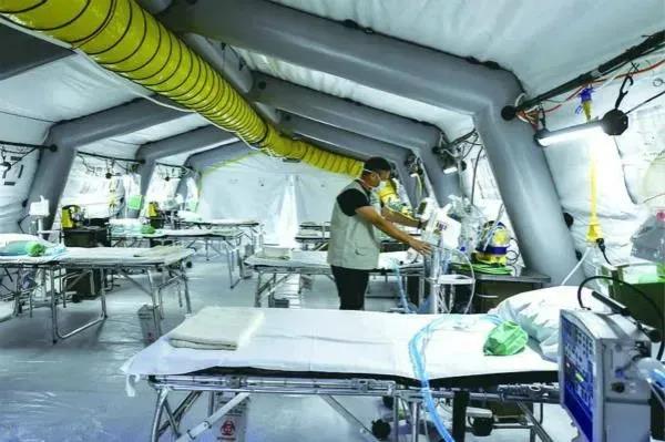 這種用充氣帳篷臨時(shí)搭設(shè)而成“方艙醫(yī)院”,一天之內(nèi)就能搭設(shè)完畢,在帳篷內(nèi)引入各種治療設(shè)備后,這些臨時(shí)醫(yī)院便可交付使用。帳篷內(nèi)具備一定的保溫功能,內(nèi)部還設(shè)有用電插座,一般一個(gè)帳篷內(nèi)可以容納4個(gè)病人同時(shí)隔離,醫(yī)護(hù)人員出入帳篷前都會(huì)進(jìn)行消毒工作。