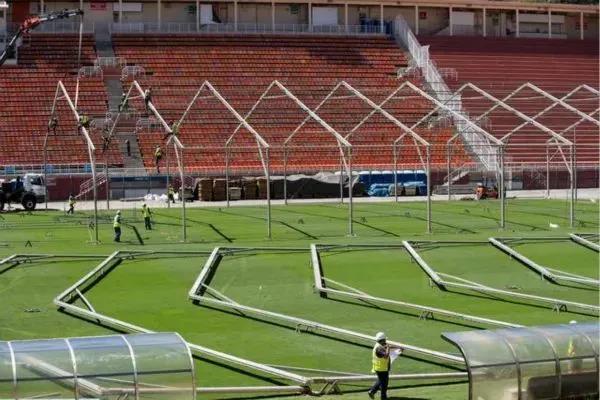 ▲ 3月23日在巴西圣保羅市帕卡恩布體育場拍攝的方艙醫(yī)院施工現(xiàn)場