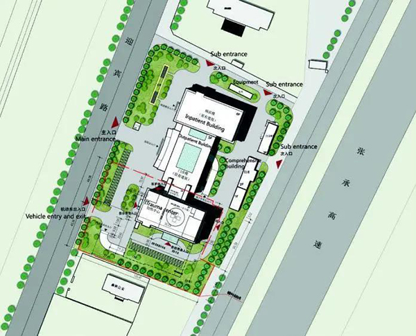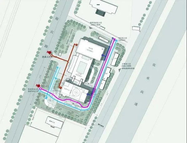 在該項(xiàng)目的交通規(guī)劃中,設(shè)計(jì)方把原院區(qū)的主入口改為人流主入口,并在場(chǎng)地西南方向設(shè)置了一個(gè)車行入口,一方面是緩解主入口人車混行的交通壓力,另一方面是方便急救車通行。通過(guò)合理的交通組織設(shè)計(jì),旨在實(shí)現(xiàn)人流、物流、車流等交通流線清晰明確、易于識(shí)別,減少擁堵和迂回。