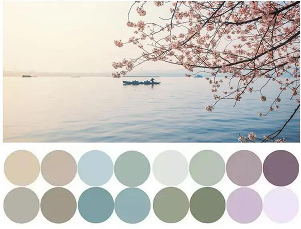 空間的主色調(diào)取色西湖的“青”色,為了追求氤氳之氣,讓畫卷更具溫婉雅致,設(shè)計(jì)運(yùn)用了莫蘭迪(Morandi&Grey)配色原則,以高級灰來表達(dá)這種迷蒙之美。