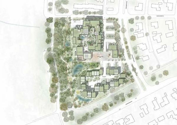 在療養(yǎng)院中心的內(nèi)部庭院花園中利用了大自然的療愈作用,那里有一個(gè)種植花園,而界限清晰的外圍的森林也與大自然融為一體。這為養(yǎng)老小鎮(zhèn)的居民以及當(dāng)?shù)厣鐓^(qū)的兒童和成人創(chuàng)造了一個(gè)迷人的環(huán)境。