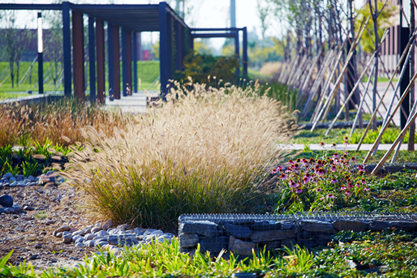 設(shè)計(jì)以運(yùn)用鄉(xiāng)土植物與材料為出發(fā)點(diǎn),打造低成本、動(dòng)態(tài)生長的景觀,用低維護(hù)的后期管理實(shí)現(xiàn)園區(qū)環(huán)境的可持續(xù)發(fā)展,展現(xiàn)全生命周期的景致變化與美感,營建面向未來的產(chǎn)業(yè)園區(qū)。