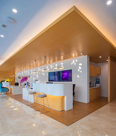 設(shè)計(jì)師在協(xié)調(diào)內(nèi)部空間與自然環(huán)境的同時(shí),還需大膽的創(chuàng)新,利用科技給空間帶來(lái)不一樣的體驗(yàn)感。上海紅睦房醫(yī)療綜合門診內(nèi)的生殖門診部以“生命之樹”的主題,利用自然與光,傳達(dá)生命的延續(xù)和對(duì)美好生活的向往,借助科學(xué)技術(shù)的手段,我們打造了抽象的樹干輪廓線條和發(fā)光的葉片,與外部的自然光影變化相呼應(yīng),創(chuàng)造了自然與科技的和諧關(guān)系。
