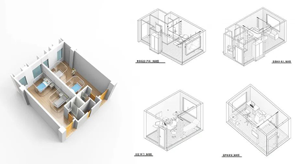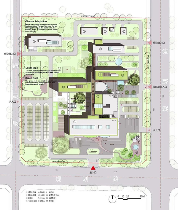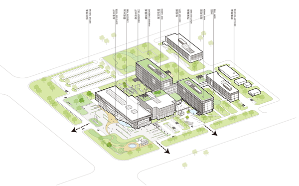 建筑設計同時在東西的兩個病房樓,北側辦公樓醫(yī)技樓的局部設計了屋頂花園,方便醫(yī)患病人和工作人員的季節(jié)性使用。同時,主街長廊的頂層被定義為“康復街區(qū)”,形成傳統(tǒng)街道效果,起到放松心情的作用。