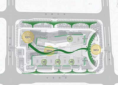 門診主入口廣場(chǎng)與建筑中心的下沉庭院連通,形成景觀軸線的同時(shí),將場(chǎng)地東側(cè)體育公園的景觀引入院區(qū)。廣場(chǎng)通過設(shè)置環(huán)抱式硬鋪及點(diǎn)綴花池,賦予了入口空間舒展、大氣的韻律感。中心花園是場(chǎng)地西側(cè)相對(duì)開放的空間,以自然、綠色的環(huán)境為主。植物采用片植或列植,疏密有致,色彩豐富,勾勒出生機(jī)盎然的自然畫卷。醫(yī)療樓的南北兩側(cè)為下沉式綠化,將室外景觀引入地下,為地下一層的自然采光、通風(fēng)創(chuàng)造良好條件,步行人員可通過室外臺(tái)階到達(dá)地下一層。