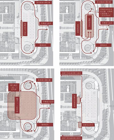 目前國(guó)內(nèi)大型醫(yī)院周邊交通普遍擁堵,主要是由于醫(yī)院沒有合理的交通規(guī)劃,缺乏充足的停車位。朝陽(yáng)醫(yī)院東院的設(shè)計(jì)充分考慮了交通規(guī)劃,設(shè)置立體交通體系,并預(yù)留遠(yuǎn)期立體停車設(shè)施的空間。方案還在地下一層?xùn)|側(cè)設(shè)置臨時(shí)停車區(qū),車輛進(jìn)入地下一層后落客,隨后進(jìn)入臨時(shí)泊車區(qū),可短暫停留后離開。方案還規(guī)劃了供長(zhǎng)時(shí)間停留的車輛使用的地下二層和地下三層的車庫(kù),泊車后可通過門診自動(dòng)扶梯或垂直電梯到達(dá)首層門診大廳。考慮到急救的緊迫性,方案于場(chǎng)地北側(cè)設(shè)置急救車專用通道,急救車可通過專用通道迅速到達(dá)急救入口。