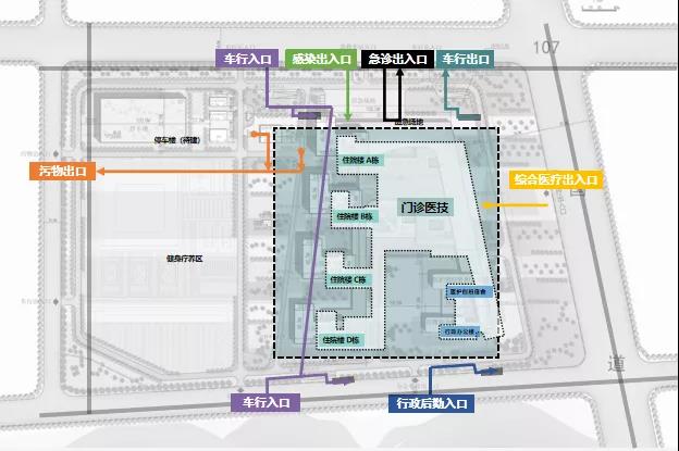 設(shè)計有效的組織患者、探視、醫(yī)護、辦公人群等相關(guān)動線交通與停車規(guī)劃,設(shè)置識別性強的交通體系以及清晰統(tǒng)一的標識系統(tǒng)。綜合醫(yī)療區(qū)主要人行出入口面向107國道,以銜接城市公共交通站點。對外車行主入口主要布置地塊南北兩側(cè)城市規(guī)劃道路;通過汽車坡道將車流引入地下組織交通流線。南側(cè)設(shè)置兩個車行出入口,自東向西依次為辦公車行、供應車行。北側(cè)設(shè)車行出入口三個,自東向西依次為門診車行、急診急救車行入口、住院車行出口。西側(cè)設(shè)兩個車行口,自北向南依次為污物出口、應急車行出口。各個功能區(qū)入口和出口分離,避免交叉。院區(qū)道路貫通,形成環(huán)道,保證消防車同行。