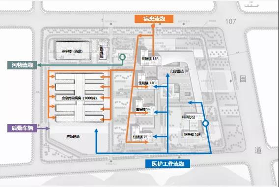 項目主要分為三個功能分區(qū),綜合醫(yī)療區(qū)、預留應急區(qū)、行政辦公及生活區(qū)。
