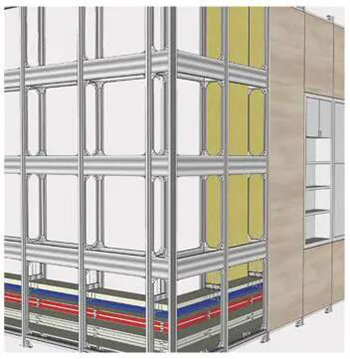 裝配式設(shè)計包括集成吊頂體系、集成設(shè)備體系、集成地面體系、裝飾面層體系、集成龍骨體系和裝配部件體系,各體系可組合可搭建,增加空間柔性。
